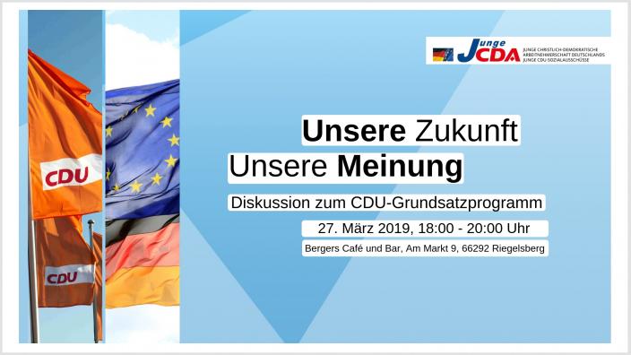 08.03.2019 Junge CDA lädt zur Veranstaltung "Unsere Zukunft, unsere Meinung" ein Die Junge CDA lädt zur Veranstaltung "Unsere Zukunft, unsere Meinung" ein. Geplant ist eine Diskussion zum Grundsatzprogramm der CDU im Rahmen...